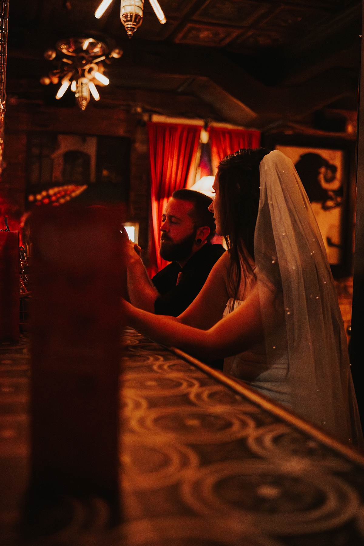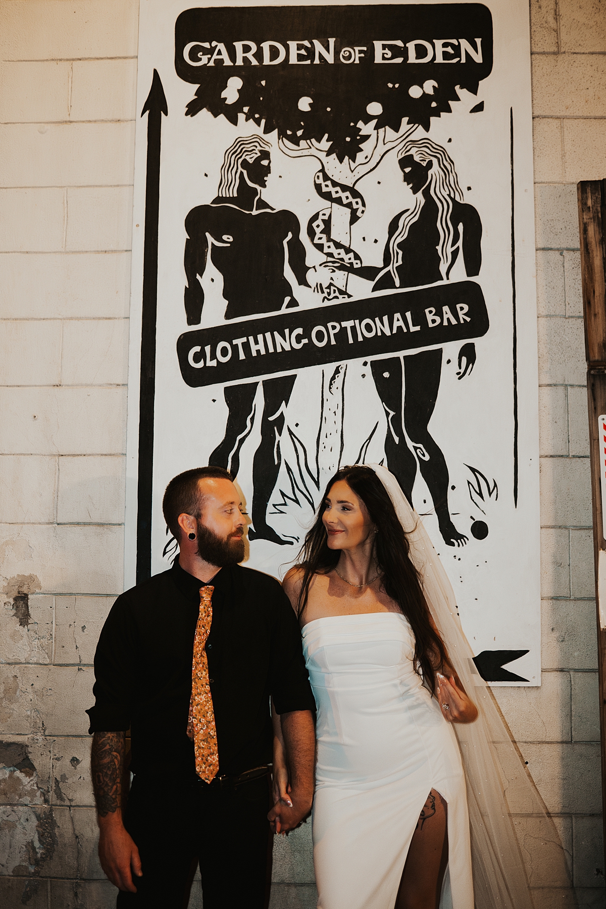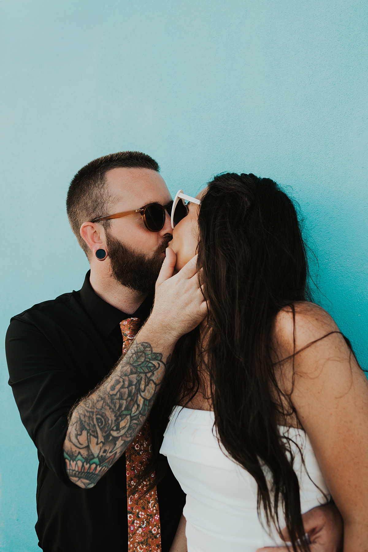 To incorporate some colorful, retro vibes and to celebrate the beginning of their marriage, we scootered over to Tropic Cinema. This retro-inspired movie theatre is the perfect backdrop for any couples wanting photos with some vintage feels. A+C popped champagne on the street and soaked in the moment of becoming husband and wife.